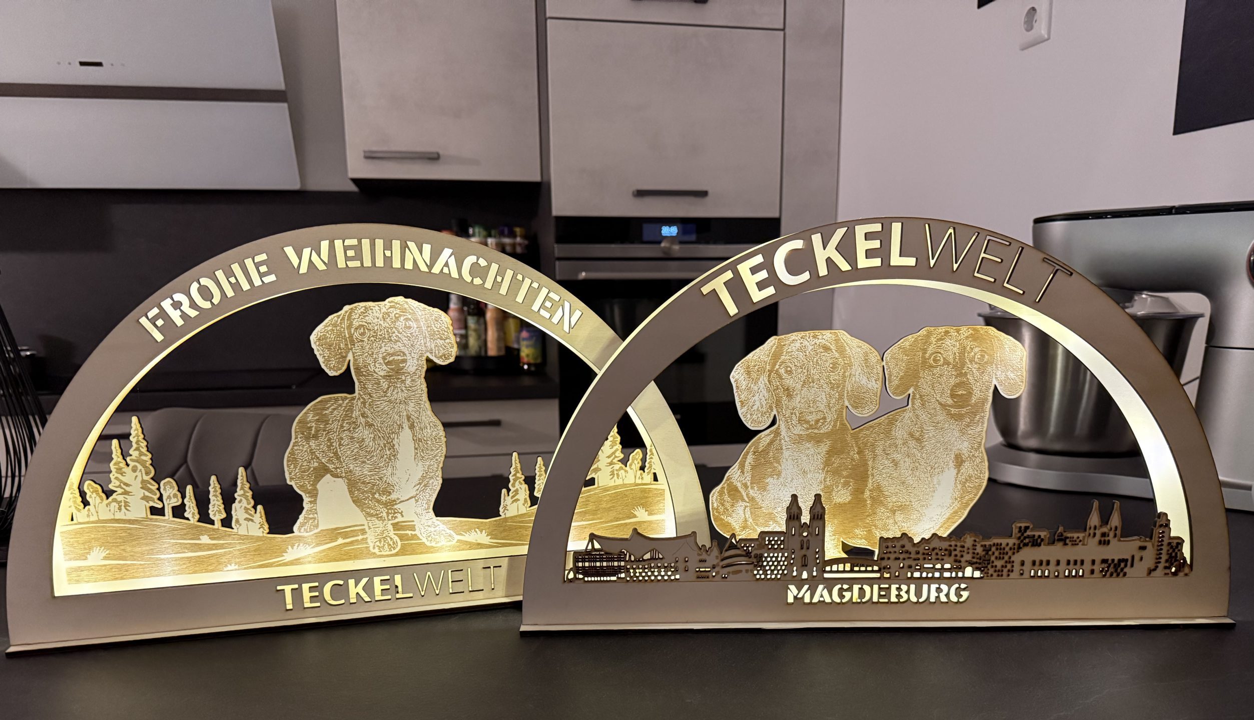 Alle Schwibbögen werden ausschließlich auf Bestellung und individuell gefertigt (handmade) und sind somit jeder für sich ein Unikat. Ein Umtausch / Rücksendung ist daher ausgeschlossen. Sie sind nur für den Einsatz in Innenräumen vorgesehen und sollten vor Feuchtigkeit geschützt werden. Beleuchtung: Die LED-Lichterketten sind Batteriebetrieben mit Timerfunktion (2x AA, 1,5V – nicht im Lieferumfang enthalten). Material: unbehandeltes Pappelsperrholz – Holz ist ein natürlicher Werkstoff, daher können kleine dunkle Einschlüsse oder Streifen im Material auftreten. Diese stellen keine Qualitätsmängel dar. Die natürliche Holzstruktur beeinflusst das Laserergebnis, sodass jeder Schwibbogen ein Unikat ist und sich leicht von anderen unterscheidet. Sockel/ Erhöhung: Du kannst bei deiner Bestellung angeben, wie hoch (cm) die Sockel für die Erhöhung für deinen Schwibbogen sein sollen, damit es optimal für den vorgesehenen Stellplatz passt. Produktions-/ Lieferzeiten: Die Produktionszeit beträgt 5 – 10 Werktage, nach Zahlungseingang. Wir sind bemüht die Schwibbögen im Anschluss so schnell wie möglich zu versenden. Zahlung: Sie erhalten nach Bestellungseingang eine Rechnung zum überweisen! Direkt nach dem Zahlungseingang starten wir die Produktion. Foto: Bitte senden Sie das gewünschte Foto Ihrer Fellnase per E-Mail an kontakt@teckelwelt.com und achten Sie darauf, dass es eine möglichst gute Qualität hat.