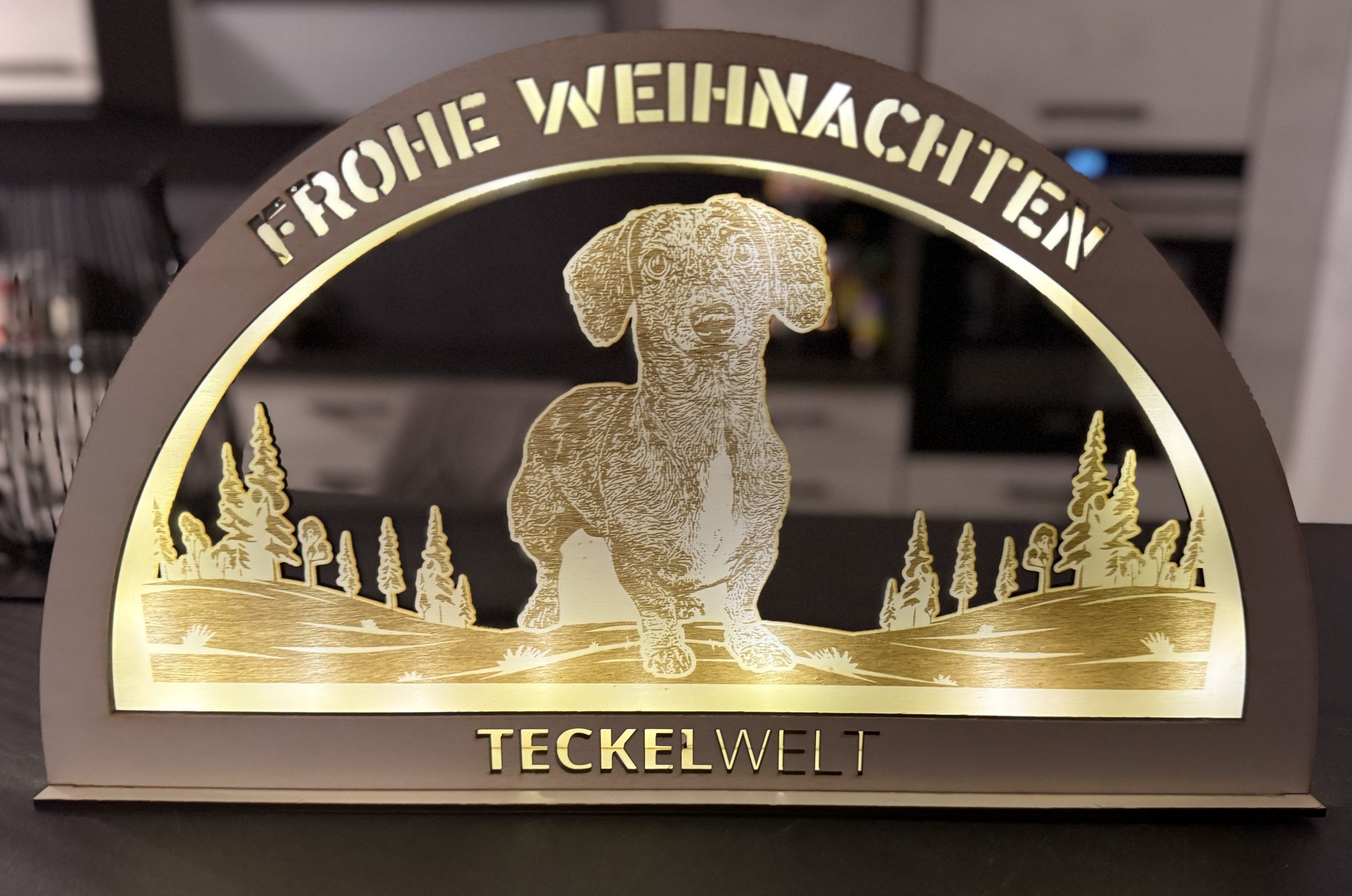 Verleihe deinem Zuhause in der dunklen Jahreszeit einen ganz besonderen Glanz: Unser handgefertigter TECKELWELT® – Schwibbogen >>Special<< vereint stimmungsvolles Licht mit dem Bild deiner Fellnase(n).