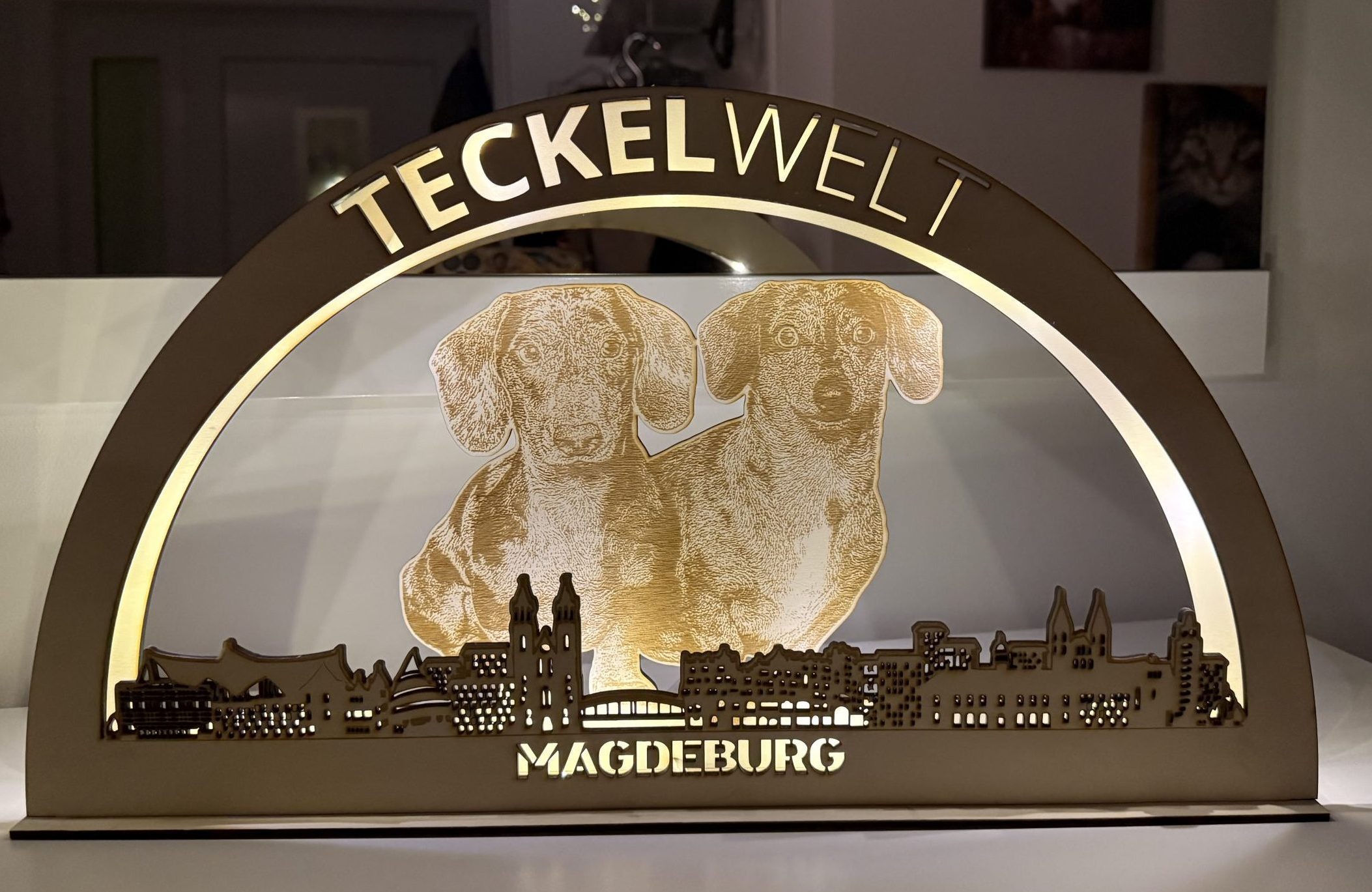Verleihe deinem Zuhause in der dunklen Jahreszeit einen ganz besonderen Glanz: Unser handgefertigter TECKELWELT® – Schwibbogen >>Standard<< vereint stimmungsvolles Licht mit Magdeburger Skyline & TW-Dackel-Motiv.